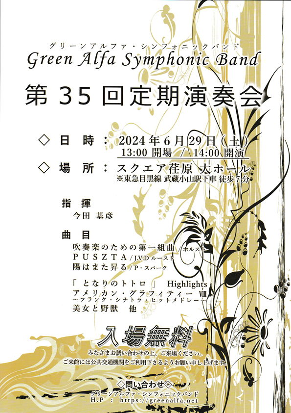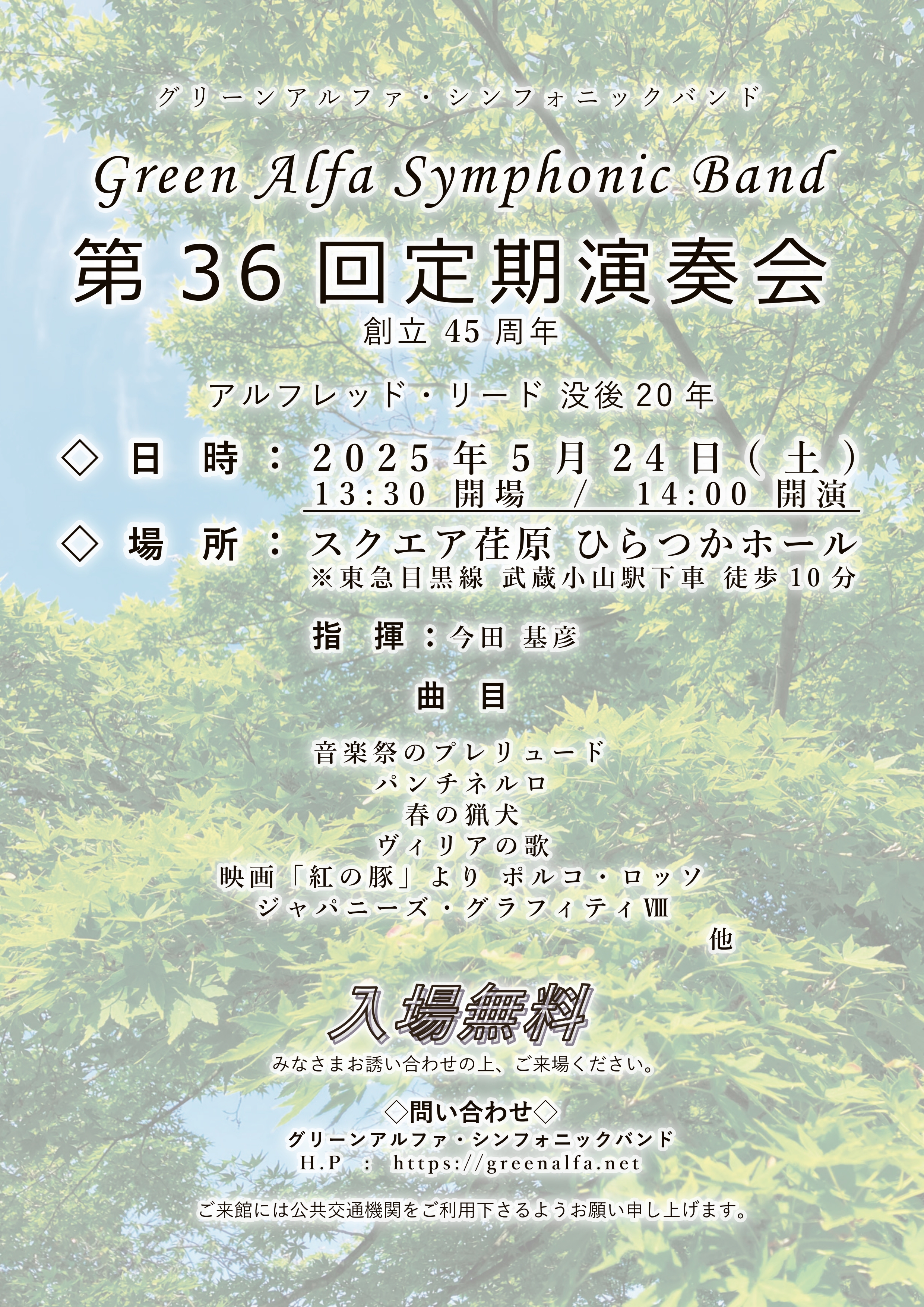 バック・トゥ・ザ・フューチャー / 「天空の城」ラピュタ 君をのせて / スマイル(モダン・タイムスより)~テリーのテーマ(ライムライトより) / 美女と野獣 / 踊りあかそう / バンドの為の民話 / 祝典行進曲 / ヨークシャー・バラード / セレナータ / 音楽祭のプレリュード / 星条旗よ永遠なれ